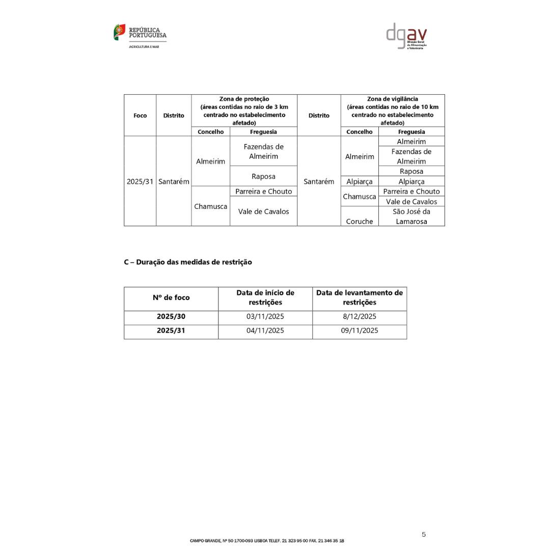 A Direção-Geral de Alimentação e Veterinária (DGAV) confirmou recentemente um foco de Gripe Aviária de Alta Patogenicidade (H5N1) no concelho da Chamusca, na União de Freguesias de Parreira e Chouto.